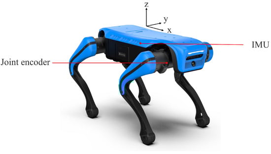 The quadruped robot platform used in this study is a product of Hangzhou Yunshenchu Technology Co. Ltd., Hangzhou, China named “JueYing Lite2 Professional Edition”. JueYing Lite2 Professional Edition is a versatile intelligent quadruped robot with 12 degrees of freedom and various motion gaits. The robot stands 355 mm tall, measures 540 mm in length from head to tail, 315 mm in width, and weighs 10 kg. The sensors used in the experiment include: IMU and joint encoder sensors. The placement of these sensors on the robot is illustrated in Figure 9.
