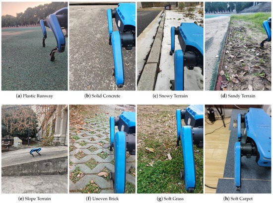 Currently, the methods employed for environmental perception can be broadly categorized based on exteroceptive sensors and proprioceptive sensors [1,2]. Exteroceptive-sensor-based terrain perception methods include LiDAR-based [3,4], camera-based [5,6,7,8], and sound-based [9,10,11,12] techniques. Methods based on external sensors enable non-contact advance judgments and predictions of terrain, transmitting perception results to the controller for corresponding strategy adjustments without physically interacting with complex terrains. Sound-based terrain perception methods capture sound signals using microphones installed on the robot’s body, processing them to derive terrain-related feature information. The methods based on proprioception for terrain feature perception often do not directly acquire environmental information but instead infer changes in the terrain by monitoring variations in the robot’s own state. Precisely because proprioception-based perception methods acquire terrain features indirectly, methods relying on a single proprioceptive sensor often have limited effectiveness. Therefore, many studies focus on multi-sensor fusion to enhance the performance of such methods [13,14,15].