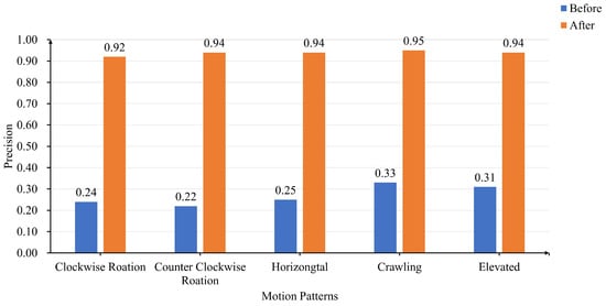 To demonstrate the influence of motion patterns on model accuracy, the proposed model was tested on terrain data with different motion patterns. It can be seen that there is a significant drop in model accuracy, and the model becomes less reliable, which undoubtedly confirms the hypothesis initially proposed in this study. However, when the model incorporates information about the relevant motion patterns into the training data, the impact of the motion patterns is mitigated. As shown in Figure 12, the model accuracy improves.