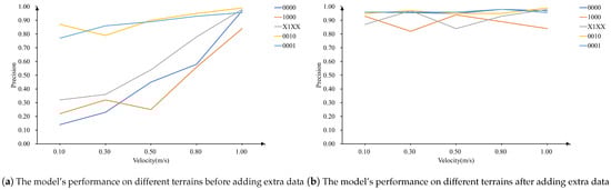 Similarly, as illustrated in Figure 13, the model trained at a velocity of 1 m/s demonstrates performance variations when tested at other velocities. The classification accuracy of labels “0000”, “X1XX”, and “1000” shows significant sensitivity to variations in movement velocity. However, this impact is mitigated after supplementary training with multi-velocity data.