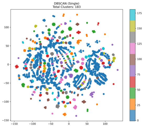 - DBSCAN (Single) Tends to Over-Segment:With the chosen parameter settings, DBSCAN produced an exceptionally large number of clusters (e.g., 183). This suggests that the algorithm partitioned the data into many small, densely packed subsets, resulting in over-segmentation. While DBSCAN can discover arbitrarily shaped clusters and automatically detect noise, an inappropriate eps threshold (particularly a small one) can fragment the data excessively. The t-SNE visualization (183 different color segments) underscores this effect.