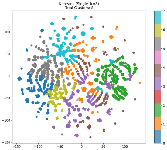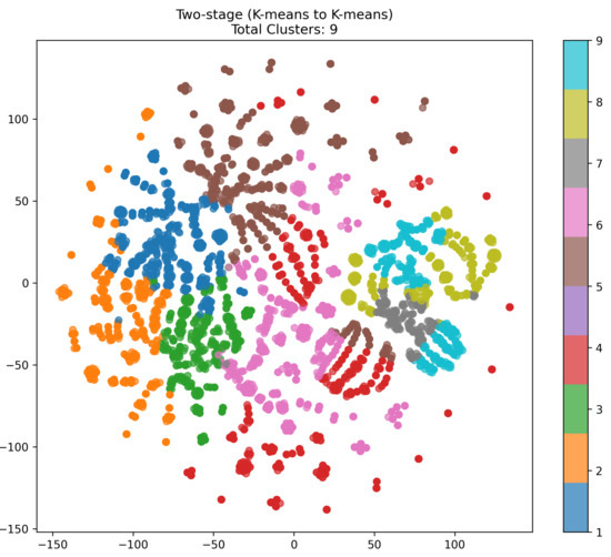 Figure 5. t-SNE visualization image generated from K-means to K-means (2-stage) clustering results. - Comparison to Single K-means or DBSCAN:Unlike single K-means (which fixes a single k for the entire dataset) or DBSCAN (which depends on a density threshold), the two-stage method can capture both coarse- and fine-grained structures. The Stage 1 broad grouping filters out the overall distribution, and Stage 2 subdivides each cluster. This often leads to more balanced subclusters than a direct single-step method.