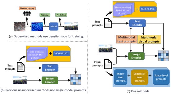 In recent years, language–image contrast pre-trained models, such as CLIP [9], have achieved remarkable success in various visual tasks, including object detection [10], semantic segmentation [11], and image generation [12], thanks to their excellent transfer learning capabilities. CLIP learns visual representations from large-scale noisy image–text pair data, but when applied to downstream tasks, it often relies on manually designed prompts (e.g., “a photo of [CLASS]”), which are typically based on intuition and experience, making it challenging to achieve optimal results. To address this issue, researchers have developed automated prompt tuning techniques, such as CoOp [13], CoCoOp [14], and VPT [15]. These methods primarily focus on optimizing prompts for a single modality (either visual or textual), as shown in Figure 1b. However, research on simultaneous prompt tuning for both visual and textual modalities—leveraging the complementary advantages of multimodal data to enhance the accuracy and robustness of dense counting tasks—has not been fully explored.