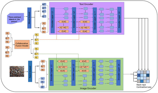 This study proposes a method for optimizing the visual-language model, with the overall framework consisting of two phases: training and testing. Our approach enhances the model’s numerical perception by constructing ordered text prompts and guiding the image encoder to learn ordered embedded representations through cross-modal alignment losses. Through the hierarchical recursive injection of visual information, the text encoder achieves layer-by-layer fusion of textual and visual prompts, improving the representation capability of multimodal information. The image encoder interacts deeply with the text prompts at each layer of the transformer, enhancing the synergy between visual features and text information. The multimodal collaborative fusion module enables bidirectional interaction between textual and visual information through self-attention and cross-modal attention mechanisms, thereby improving the model’s ability to understand and process complex scenes. Finally, the density estimation result is generated by matching the image and text. The overall architecture of the model is shown in Figure 2.