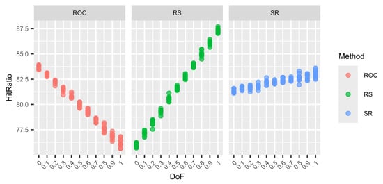 The graphs (Figure 1, Figure 2, Figure 3 and Figure 4) show no clear difference in the variation within each DoF mix for the different methods. However, it is clearly visible that the variation within each DoF mix for ROC and RS is smaller than the variation between different DoF mixes. The graphs clearly show that the SR method behaves very stably for different DoFs.