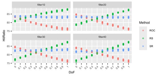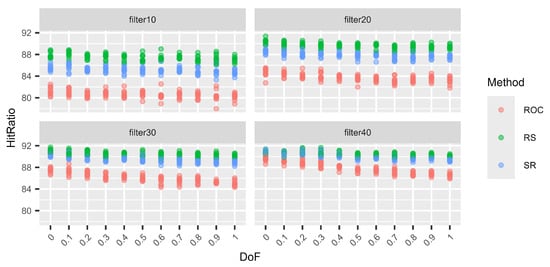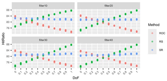 Next (Figure 5, Figure 6, Figure 7 and Figure 8), we consider different levels of filters for the weight vectors. Again, a filter of 0.1, for example, means that a weight vector is resampled if the distance between the two largest weights is larger than 0.1. Hence, for a filter of 0.1, the two largest weights are quite close. On the other hand, using a filter of 0.4 does not prohibit the two largest weights from being very close, but the distance cannot be larger than 0.4. Again, for each DoF mix, 10 different simulation sets each of 100,000 decision situations are simulated. Hence, on the vertical axis, the variation in the hit ratios of the different surrogate weight methods is visible. This is performed for the combinations of three criteria and three alternatives (Figure 5), six criteria and six alternatives (Figure 6), nine criteria and nine alternatives (Figure 7), and twelve criteria and twelve alternatives (Figure 8).