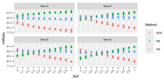 We can see that the smaller the filter (more intrusive), the better RS performs and the worse ROC performs. However, this behaviour approaches the performance of no filters, as in Table 19, Table 20, Table 21 and Table 22, with increasing filter size. This behaviour is expected. With smaller filters, the more extreme weight vectors that can result from unfiltered N–1-generation are rejected, and hence, ROC cannot profit from its good performance for these more asymmetric weight vectors. On the other hand, RS benefits from small filters compared to the other two methods because it generally performs very well for N DoF, which normally results in more symmetric weight vectors. Finally, RS again shows its very stable performance, regardless of the filters or the DoF.