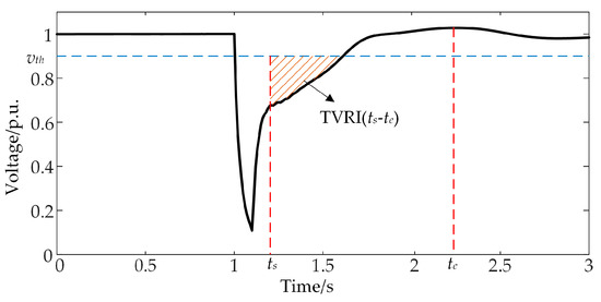 where vth is the lower voltage limit, vt is the effective voltage of bus i at time t, and ts and te are the start time and end time for the calculation of the TVRIi, respectively. TVRIi quantifies both the magnitude and duration of bus i’s voltage falling below the limit vth within the concerned period ts to te, corresponding to the shaded area shown in Figure 1. A smaller TVRIi indicates a better voltage recovery performance and higher transient voltage stability.