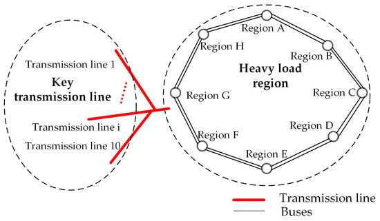 This method is applied to the location and capacity optimization of SCs in the weak areas of the S province power grid. Within the grid, 10 typical power input transmission lines are selected for the transient voltage security study. The network topology of the load-center region is shown in Figure 3.