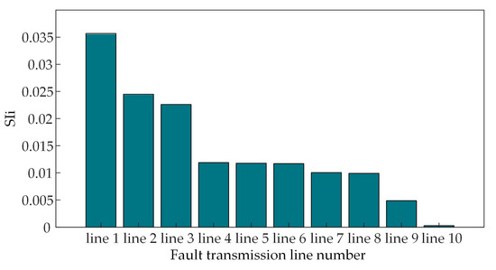 The optimization study for transient voltage security in weak areas begins with analyzing the impact of key transmission line faults. Based on engineering experience, transmission lines 1–10, which supply power to the heavily loaded region, are selected for research. These lines, despite having a relatively lower priority, exhibit higher fault occurrence probabilities, and their faults directly affect transient voltage levels within the heavy-load region. They are selected to conduct N-1 three-phase-to-ground short-circuit faults separately, thereby forming the fault set. For each fault in the set, EMT simulations are performed. The transient voltage trajectories of buses in areas A-G are recorded, and the SI is calculated using Equation (2). Results are shown in Figure 4.
