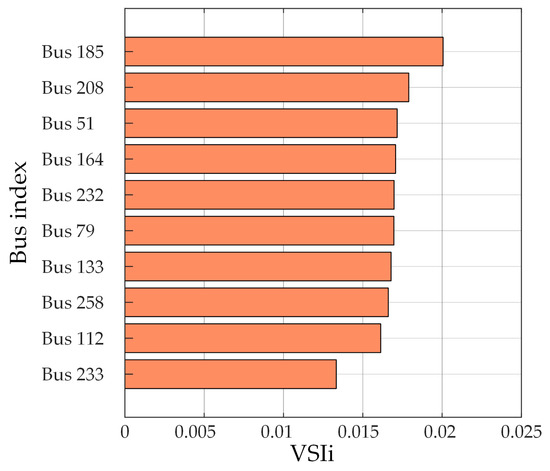 To conduct the analysis, set transmission line 1 to a three-phase-to-ground short-circuit fault, inject 100 Mvar of reactive power into every bus node in areas A–H, and then sequentially perform EMT simulations. With the steady-state voltage variations at all buses, the node-to-node VSI table and the node-to-region VSIi are calculated using Equations (3) and (4). A higher VSIi value indicates a better overall voltage enhancement at all buses with reactive power compensation at node i. To obtain the highest values, sort VSIi and select the top 10 nodes as candidates, including Bus 185, Bus 208, Bus 51, Bus 164, Bus 232, Bus 79, Bus 133, Bus 258, Bus 112, and Bus 233, as illustrated in Figure 5.