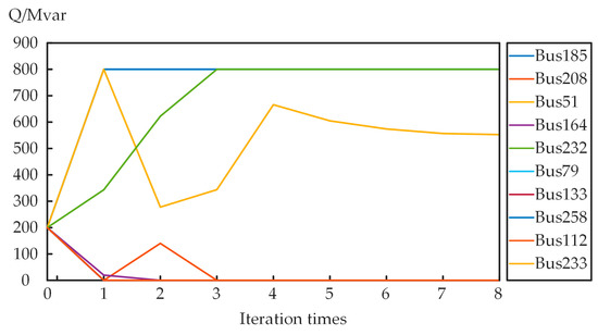 As shown in Figure 6, all candidate nodes are initially equipped with a 200 Mvar SC. After the first EMT simulation and optimization, the capacities of Bus 185, Bus 232, and Bus 51 increase, while the capacities of other buses approach zero. After the second simulation and iteration, the capacity of Bus 185 reaches its maximum and remains unchanged, while the capacity of Bus 232 increases further. For Bus 51, the optimization suggests capacity reduction, while Bus 208 begins to increase. In the subsequent iterations, the configuration capacity of Bus 185 remains constant, and Bus 232 attains its limit and stabilizes, but Bus 208’s configuration capacity decreases to zero after the third iteration. Subsequent iterations focus on adjusting the capacity for Bus 51. After the eighth iteration and final EMT simulation, followed by another linear programming solution, the capacity change falls below 10 Mvar, satisfying the convergence condition.