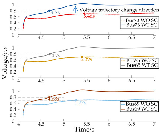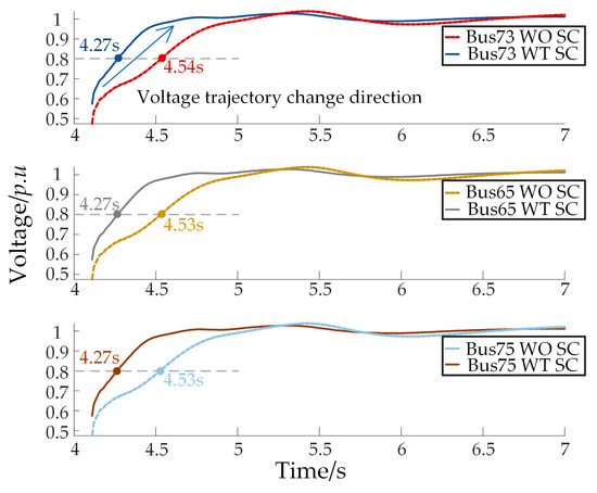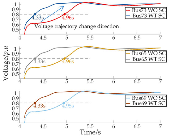 Voltage trajectories of buses without and with SCs.