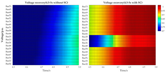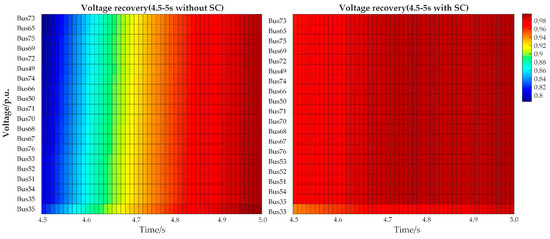 To further observe the overall improvement of the voltage within the region, the top 20 buses most severely affected by the fault without SC installation are selected. The heatmap in Figure 8 demonstrates the transient voltage variation during 0.5–1 s after the fault. From the left heatmap, it is apparent that, without SCs, the overall transient voltage across the buses ranges from 0.7 to 0.85 p.u. It can be seen on the right side that, with SCs configured, the transient voltage has improved markedly, with all buses recovering to approximately 1.0 p.u over 0.5–1 s. In general, the proposed scheme not only provides support for transient voltage but also significantly accelerates voltage recovery. The above analysis focuses on the buses most affected by the fault before the installation of SCs. Subsequently, buses exhibiting low transient voltage levels post-SC installation are analyzed. EMT simulation results are analyzed, and buses with the lowest voltages and slowest recovery times are identified, namely Bus 35, Bus 33, and Bus 36, as shown in Table 7.