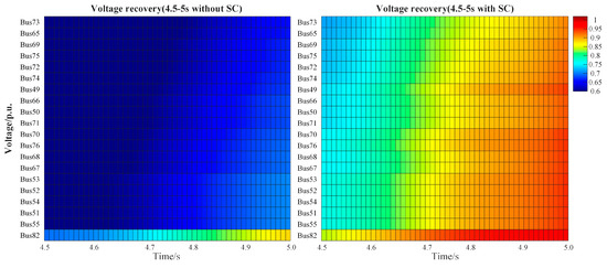 Figure 10 demonstrates the voltage heatmap of the top 20 buses most severely affected by the NO.2 transmission line fault before the installation, with observations 0.5–1 s post-fault. The left heatmap shows that without SCs, the overall voltage recovers to approximately 0.8–0.95 p.u, while all bus voltages with SCs recover to around 1 p.u within 0.5 s, as shown in the right heatmap. As a consequence, the proposed configuration shows strong voltage stability support under the fault as well.