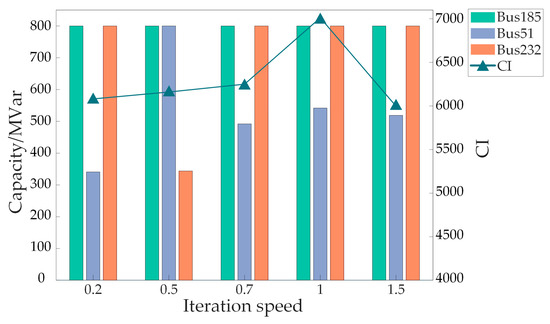 To study the impact of different iteration speeds on the SC configuration scheme, the speed is set to 0.2, 0.5, 0.7, 1, and 1.5, respectively, with the NO.1 transmission line fault, as shown in Table 5. The optimization model is solved by combining the EMT simulations with these iteration speeds. Figure 13 and Table 13 present the configuration schemes of the SC obtained under different iteration speeds and provide the number of iterations, total capacity, specific configuration schemes, and the overall TVRI and CI.