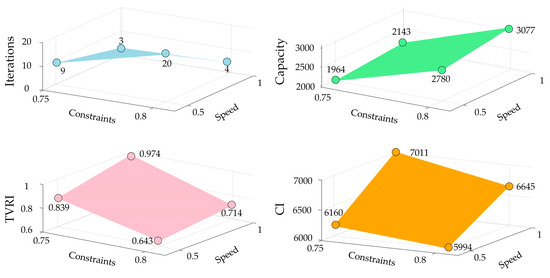 When the speed is set to 0.5, the configured capacity is lower, and the solution converges after only nine iterations. Both the TVRI of 0.839 and the CI of 6160 are satisfactory. A comparison between the solution processes for speeds of 0.2 and 0.5 reveals that, with a speed of 0.2, the search is slower but more refined, leading to better results in terms of transient effects and capacity configuration. However, the scheme obtained at speed 0.2 differs by only 1.28% in the overall CI and 1.17% in the configuration capacity compared to that obtained at a speed of 0.5, but seven more iterations consume more computational resources and solving time. Therefore, setting the speed to 0.5 offers a better balance between computational resources and the overall performance of the configuration scheme.