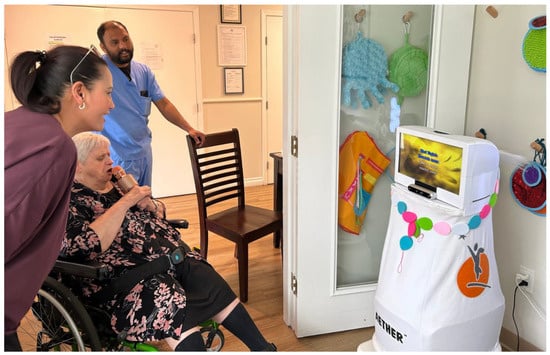 LTC residents deserve to live in dignity, comfort, and respect, and care staff are responsible for meeting the complex healthcare needs of residents with mental, physical, and sensory disabilities [4,5]. However, in an LTC setting, residents, especially those with disabilities, are vulnerable to challenges, including loneliness, isolation, and anxiety [6]. Further, Canadian LTC homes are generally under-resourced [4,6]. Regarding human resources, LTC homes face long-lasting staffing shortages due to insufficient support and increased workload [7]. A reduced staff-to-resident ratio has been linked to a decline in the quality of care, including diminished mobility support, less personalized experiences for residents, and weaker communication with families, friends, and physicians [7,8,9]. Limited resources allocated to the LTC sector also negatively impact residents’ well-being and care homes’ capacity to train and support more LTC staff [4,10,11,12]. It is more urgent than ever to use innovative ways of care delivery for the betterment of older adults with disabilities living in LTC homes.