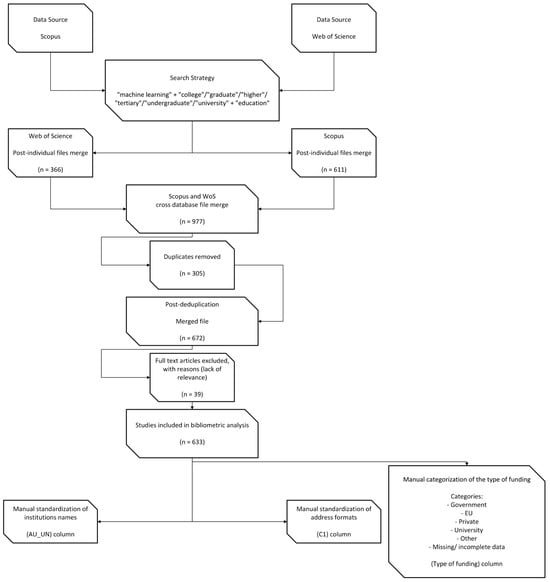After importing in Bibliometrix library the bibliographic records in BibTeX format [39], we assigned unique identifiers and merged them on Digital Object Identifiers (DOIs) using Python-based routines (pandas, version 1.4.3). By merging, we found and removed 305 duplicates, leading to a dataset of 672. No specific journals were excluded from the analysis. All retrieved publications in English from Scopus and Web of Science were considered. Subsequently, we identified irrelevant entries that mentioned ML in passing but did not address learning institutions or students in any capacity. We scanned each record’s title, abstract, and keywords for domain-specific language referencing higher education contexts (e.g., references to “teaching”, “university policy”, “student modeling”). We discarded 39 entries that failed to meet these inclusion criteria, culminating in a final corpus of n = 633 relevant publications.
