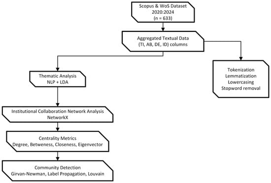 - Textual preprocessing and topic modeling: deriving thematic structures from titles, abstracts, and keywords.