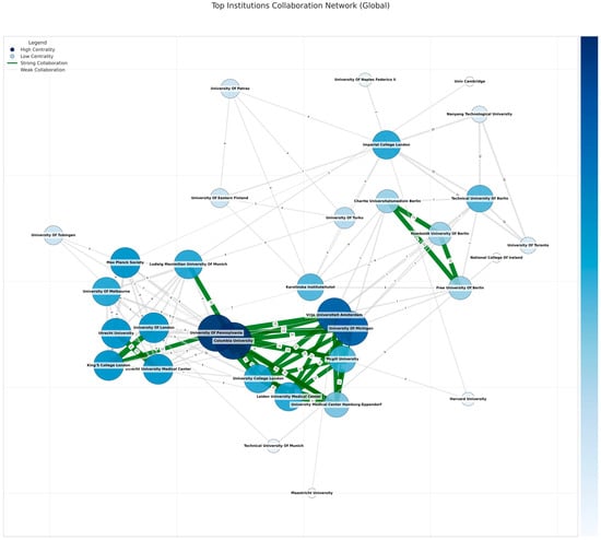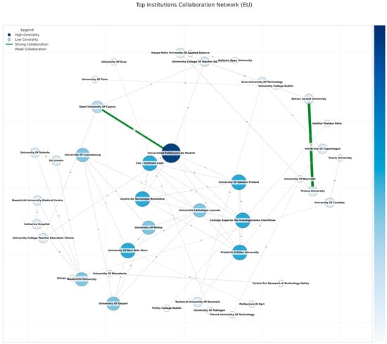 To operationalize this comparison, we classified the dataset into two groups: (1) publications with explicit EU funding acknowledgments, identified through funding statements mentioning Horizon Europe, Horizon 2020, or national grants linked to EU-supported programs, and (2) publications where funding details were absent or unreported and belong to authors from European countries. The analysis was conducted by mapping institutional affiliations within these two subsets and computing network metrics, including degree centrality, betweenness centrality, and eigenvector centrality, to assess differences in research influence and connectivity.