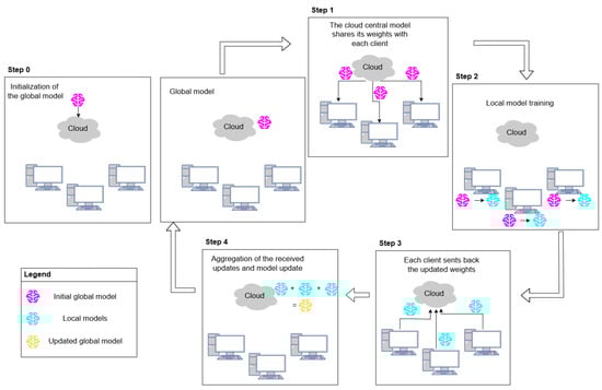 The training process must be repeated to eventually obtain a fully trained model that performs well across all client node data [30]. The initialization of the model and the repetition of the federated learning round is summarized in Figure 1.