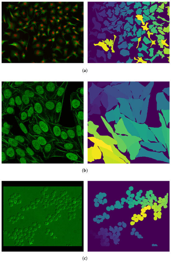 Figure 2. Sample images (on the left) and their corresponding masks (on the right) from the (a) “Cytoplasm” training set, (b) “Cytoplasm2” training set, and (c) “Cytoplasm” testing set, taken from [34]. The different shades and colors that can be observed in the masks are representative of the group of pixels identified to belong to a specific cell.