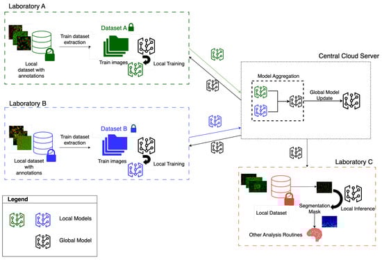 Figure 3 illustrates the FL architecture, with an example of the total of two clients contributing to the training, corresponding to two laboratories. Each laboratory trains its model on its own cell image dataset without sharing sensitive data with the other. Instead, each of them only transmits updated model weights to the cloud. The cloud server then aggregates these weights and sends the updated global model back to the clients. This architecture is scalable, allowing additional clients to join in for training or, additionally, just for downloading the global model to perform local inference. These additional clients may have limited computational resources [45], relying on the global model for inference while contributing minimally to training. As mentioned, segmentation masks obtained through the downloaded models may then be used by final users to carry out laboratory or experiment-specific analyses. The cloud-based deployment facilitates model distribution, while the FL implementation removes the need for sensitive data sharing even towards clients that do not contribute to the collaborative training phase. Furthermore, a multi-cloud environment may also be employed, where different cloud providers collaborate and share models without transferring raw data [46]. So, the federated implementation allows overcoming the challenge of data scarcity for some clients while addressing patient privacy and legal and ethical issues in clinical data sharing.