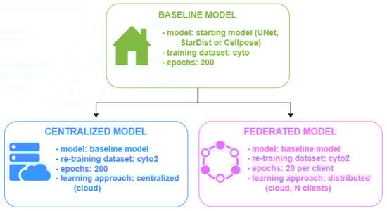 The baseline model is trained for 200 epochs on the dataset collected by Stringer et al. ( images). We then re-trained the baseline on the “Cytoplasm2” (cyto2) dataset ( images) using the two methods under evaluation: that is, centralized and federated. In the end, we obtained the following: