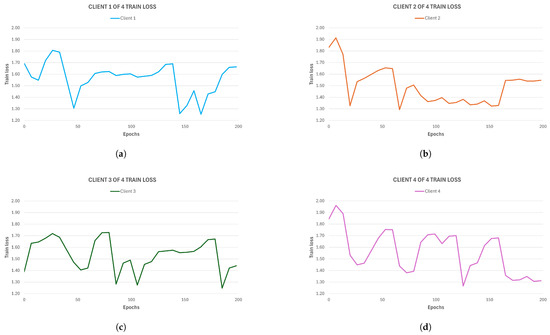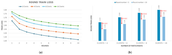 For this study, we decided to work with 20 epochs per client during local training; 10 rounds; and 2, 4, 8, and 16 clients to study the behavior of the FL framework when the number of participants changed. With respect to strategy, we chose to use the most implemented one; FedAvg is used, especially when working in a real-world scenario (diverse clients with heterogeneous data). This strategy allows researchers to build a robust approach to non-IID data and unbalanced distributions [14].