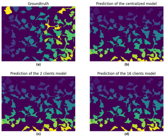 Comparison between (a) ground truth, (b) centralized model predicted mask, (c) 2-client federated model predicted mask, and (d) 16-client federated model predicted mask. The different shades and colors in the masks are representative of the group of pixels identified to belong to a specific cell.