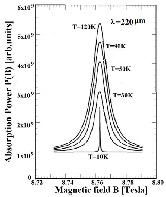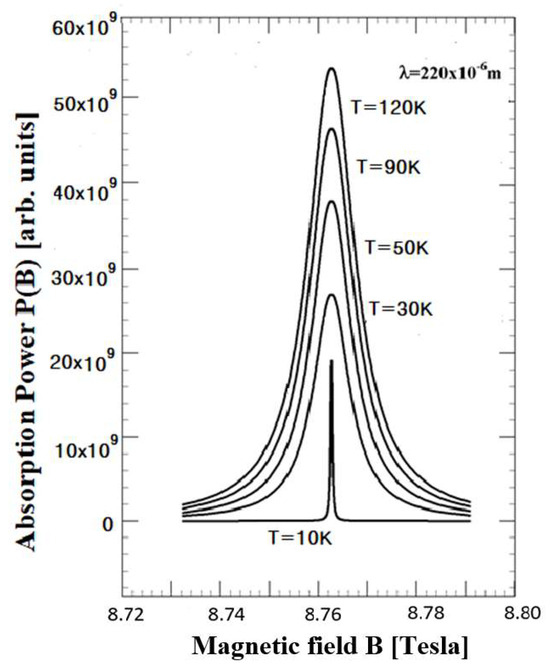 Figure 1 shows the effect of the magnetic field on the LS of GaAs under a specific external field with a wavelength of λ = 220 μm and temperatures of T = 10, 30, 50, 90, and 120 K. At T = 10, the LS exhibits a sharp and narrow peak near B ≈ 8.76 T, indicating strong resonance behavior with minimal thermal broadening. As T increases, the peak broadens significantly, reflecting the growing thermal interaction effects in the system. The gain factors applied to the curves for T = 30, 50, 90, and 120 K highlight the dramatic rise in absorption power with increasing T. This behavior suggests that the in GaAs is strongly temperature-dependent, with higher temperatures enhancing scattering mechanisms or transition probabilities that contribute to the LS. The broadening of the peak at elevated temperatures also indicates a reduction in coherence due to increased phonon interactions.
