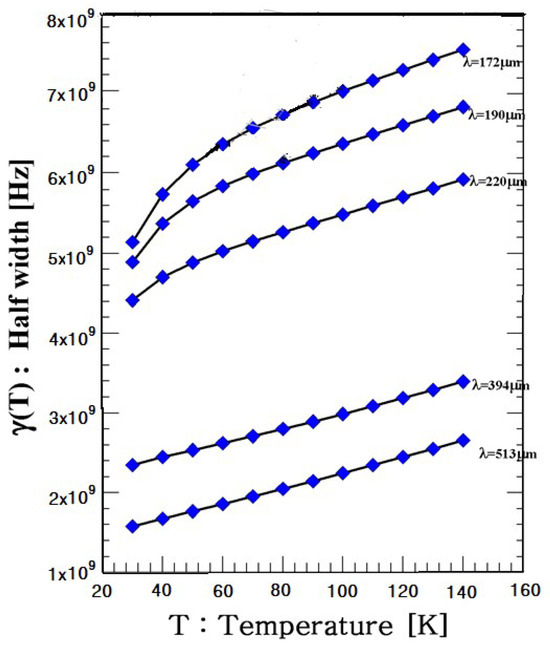 Figure 2 illustrates the temperature dependence of the LW for GaAs under external fields with λ = 172, 190, 220, 394, and 513 μm. At all wavelengths, the LW increases as T rises, demonstrating a strong thermal dependence. Shorter wavelengths (λ = 172, 190, 220 μm) exhibit steeper slopes, indicating a more pronounced increase in with T. In contrast, longer wavelengths (λ = 394, 513 μm) show a more gradual rise in LW.