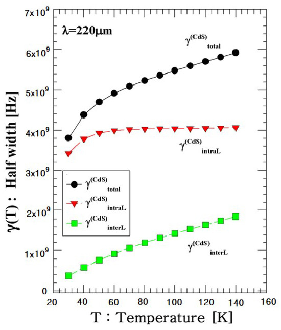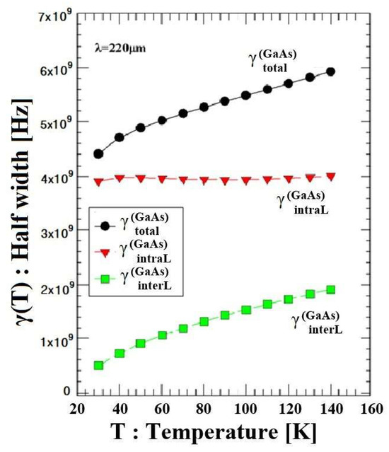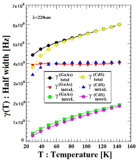 Figure 10 illustrates the effect of temperature on LW for GaAs and CdS at a fixed wavelength of λ = 220 μm, with total, intra-, and inter-Landau-level transitions. The total LW of CdS is consistently higher than that of GaAs across the temperature range, reflecting stronger phonon interactions in CdS. Additionally, the intra-level contributions remain nearly temperature-independent for both materials, while the inter-level contributions exhibit a noticeable increase with T. This demonstrates that the overall temperature dependence of LW is primarily driven by the inter-level transitions for both GaAs and CdS.
