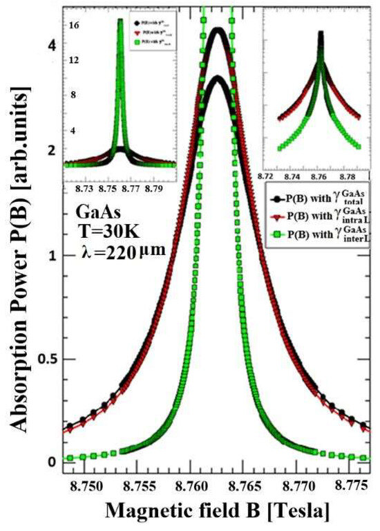 Figure 4 further investigates the contributions of intra- and inter-Landau-level transitions to the LW and their impact on the LS in GaAs. Specifically, it compares with its components: and . The total absorption power curve closely matches the behavior of the intra-level contribution with , highlighting the dominant role of intra-level transitions in determining the overall broadening. The inter-level contribution with is less significant, as its effect on is noticeably weaker. This comparison underscores the dominant influence of intra-Landau-level transitions on the broadening of absorption power in GaAs at T = 30 and λ = 220 μm. The agreement between the LS components in Figure 3 and the absorption power broadening in Figure 4 demonstrates the strong correlation between line width contributions and the overall absorption process.