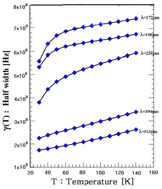 Figure 6 illustrates the temperature dependence of the LW of CdS for various wavelengths of λ = 172, 190, 220, 394, 513 μm. At all λ, LW increases with rising T, demonstrating a strong thermal influence on the scattering mechanisms in CdS. The rate of increase becomes more pronounced at higher T, particularly for shorter wavelengths (λ = 172, 190, 220 μm). At any given T, the LW decreases with increasing λ, indicating weaker scattering effects for longer wavelengths (λ = 394, 513 μm). This trend suggests that shorter λ are more sensitive to thermal interactions, resulting in broader LW.