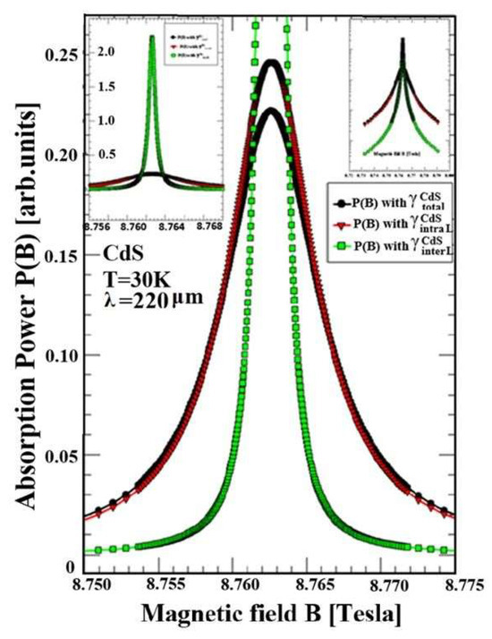 Figure 8 compares the LS of CdS at T = 30 K and λ = 220 μm, showing contributions from the total LW , intra-Landau-level LW , and inter-Landau-level LW . The shows the overall profile dominated by both intra- and inter-level contributions. The total absorption peak occurs near B ≈ 8.76 T, with a broader distribution compared to individual contributions. The contributes to a sharper and narrower peak, highlighting their dominance in determining the core structure of the absorption profile. The narrower profile indicates minimal thermal broadening for the intra-level transitions. The shows a much broader peak, reflecting the higher thermal sensitivity of inter-level transitions.