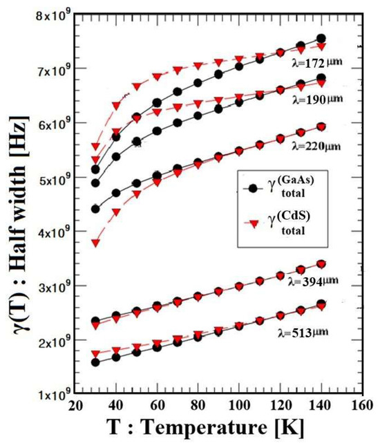 Comparisons of temperature dependence of the LWs of GaAs and CdS, , and with = 172, 190, 220, 394, 513 μm.