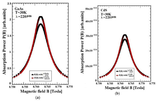 Figure 11 compares the LS of GaAs and CdS, the and with λ = 220 μm at T = 30 K. For GaAs, the absorption power exhibits a sharp peak near B ≈ 8.76 T, the total LW showing a broader profile compared to the intra-level component, indicating a significant contribution from inter-level transitions. Similarly, for CdS, the LS shows a peak at a similar magnetic field, but the total LW is more dominant relative to the intra-level contribution, reflecting stronger phonon interactions in CdS. However, the has a much larger value than the . Specifically, the value of the is nearly times than the value of . This fact confirms that GaAs exhibits much larger mobility compared to other materials. From this analysis, it is evident that thermal quantum transition properties are similar for CdS, a wurtzite-type material, and GaAs, a sphalerite structure.