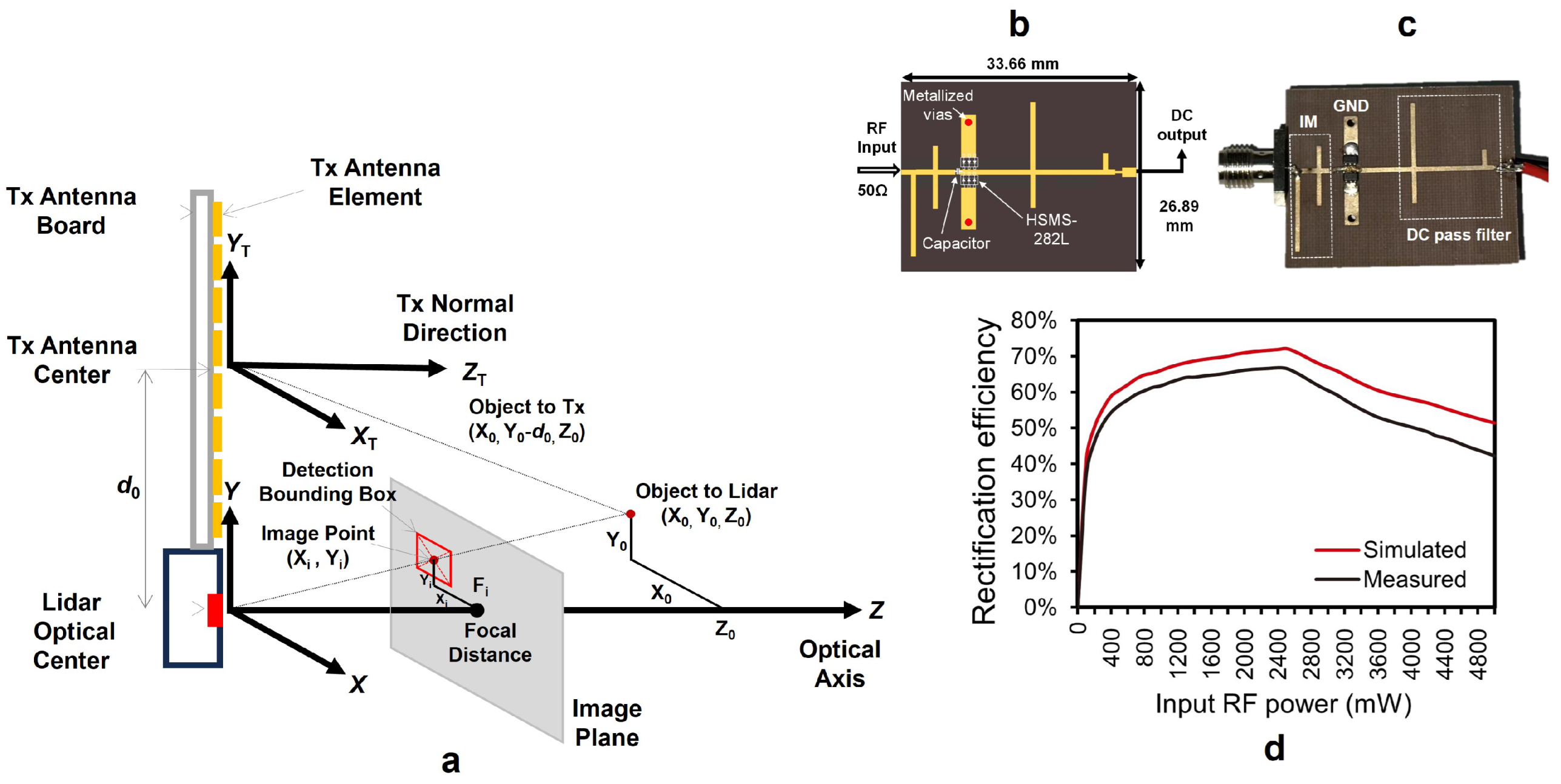 (a) The principle diagram of the spatial projection algorithm. (b) Configuration of the rectifier, (c) photography of the manufactured rectifier circuit and (d) measured and simulated rectification efficiency of the rectifier.