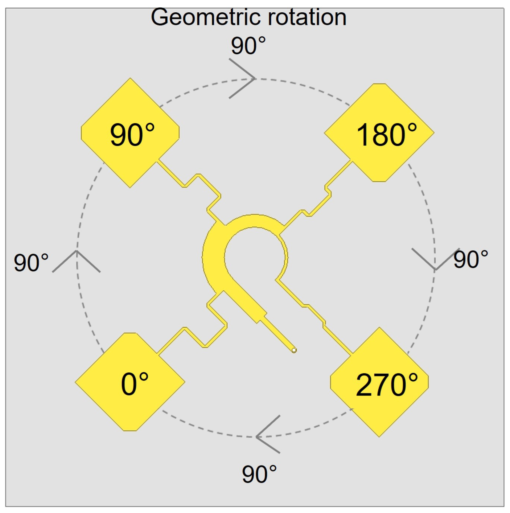 Once the design of the individual antenna element was complete, we performed three geometric rotations around a central point to form a 4-element subarray as illustrated in Figure A2. After the rotations, the spacing between the antenna elements was approximately equal to the half-wavelength of the 5.8 GHz RF wave in the vacuum, which is 26.0 mm. The four antennas were then connected to a common ring power divider, with the four ports of the divider delivering nearly equal power outputs, and a phase difference of sequentially.