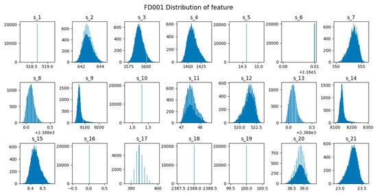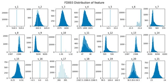 Figure 5 and Figure 6 illustrate the data distributions of the 21 sensor parameters for the FD001 and FD003 datasets. Based on the distributions, variables with constant values are removed. For example, in the FD001 dataset, sensor variables such as s_1, s_5, s_10, s_15, s_18, and s_19 are excluded.