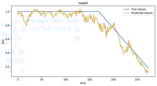 Table 2 details the performance results of RUL prediction methods on the FD001 and FD003 datasets. In terms of RMSE, our proposed model outperforms others on both datasets, with a more significant improvement on FD003. For example, on FD003, DMLP-GPT achieves an RMSE of 0.0893, representing an 8.2% reduction compared to the next-best method, BiGRU_TSAM. Figure 7 illustrates the prediction results over a full lifecycle in the FD001 test set: