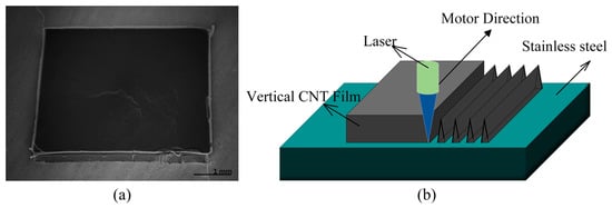The fabrication methods for a fin-shaped CNT emitter can vary. In this work, a laser ablation method was introduced. Firstly, a macroscale 5 mm × 5 mm in area, 500 μm in height, vertically aligned multi-walled CNT thick film was synthesized on a planar quartz substrate by thermal chemical vapor deposition, as shown in Figure 1a. Secondly, the CNT thick film was transferred to a conductive stainless-steel substrate using conductive silver paste. Then, a power pulsing laser illuminated the interface of the CNT and quartz substrate to detach the CNT film from the quartz. Thirdly, a focused laser with focal spots of approximately 160 μm was employed to ablate the CNT films along a predetermined motion trajectory, as shown in Figure 1b. Consequently, the designed pattern on the CNT film can be obtained. In this work, a fin-shaped CNT was ablated. By modifying the laser motion path, the fin-shaped CNT with widths of 0.3 μm, 50 μm, and 150 μm, and fin-shaped CNT arrays with spacings of 160 μm, 360 μm, and 600 μm were fabricated.