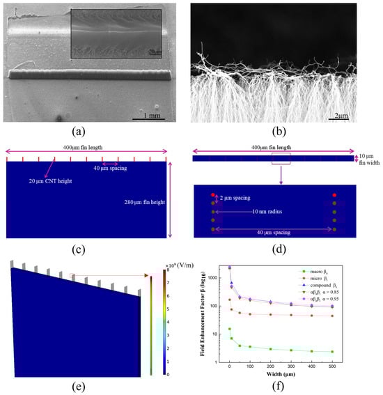 (a) Side-view SEM image of a fin-shaped CNT fabricated by laser ablation and its magnified top view (inset). (b) High-resolution SEM image of the nanotubes at the top of the fin (tilt: 45°). Schematic diagrams of the 10 μm wide simulation model: (c) front view and (d) top view. (e) Electric field intensity distribution of the 10 μm wide micro–macro compound fin structure and the electric field intensity distribution of a nanocylinder (indicated by the red box) shown on the right. (f) Calculation result of the field enhancement factors of both macro- and microstructures and their compound varied with fin width.