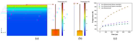 Heat transport simulation of (a) a two-dimensional fin-shaped compound structure with dense nanotips at 948 μs and (b) a one-dimensional compound structure at 94.8 μs. (c) Temperature vs. time curves for one-dimensional structure and two-dimensional structure with dense and sparse nanotips.