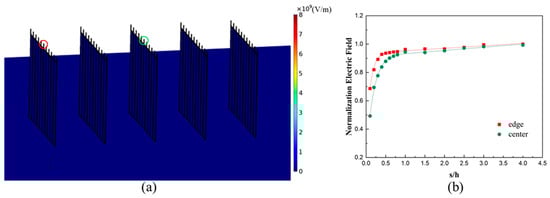 (a) Electric field intensity distribution of the fin-shaped CNT array. (b) Normalized electric field intensity as a function of s/h at the center fin and edge fin.