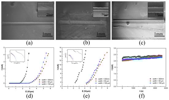 To verify the point of view, the field emission measurement of the fin-shaped CNT emitter and its array emitter were carried out. Firstly, a single fin-shaped CNT emitter structure with a fixed height of 300 μm, a fixed length of 5000 μm, and different widths of 0.3 μm, 50 μm, and 150 μm was fabricated by laser ablation, as shown in Figure 5a–c. The inset figures show magnified top–down views of the fin widths. Its DC and pulsing field emission current vs. voltage characteristics are shown in Figure 5d,e. The inset Fowler–Nordheim (FN) plots show a linear downward slope, which confirms typical field emission behavior in accordance with the F–N equations, as shown in Formulas (2) and (3). The field enhancement factor β can be estimated from the F–N plot using Formula (4) derived from Formula (2) as follows: