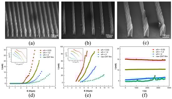 Secondly, the fin-shaped CNT arrays with different spacings of about 160 μm, 360 μm, and 600 μm were fabricated, as shown in Figure 6a–c. The three sample areas are the same at 0.25 cm2, which means that the emitter density of the fin-shaped CNT array with smaller spacing is larger. All the fin-shaped CNT emitters were ablated with a length of 5000 μm, a height of 300 μm and a width of 0.3 μm. Thus, the corresponding s/h values were 0.53, 1.2, and 2, respectively. The field emission characteristics of the three array samples and a raw CNT thick film with the same area were measured in DC and pulse modes. All test conditions were the same as mentioned above. Figure 6d,e show the current vs. electric field curves in DC and pulse modes, respectively. The maximum DC emission current was 29.56 mA, measured from the array with an s/h ratio of 0.53, and its turn-on field was 0.81 V/μm. The corresponding current density was 0.118 A/cm2. The maximum pulsed current reached 87.29 mA, with a corresponding current density of 0.349 A/cm2. The ks value was calculated to be −6.29, and then the β was determined to be 12,140.