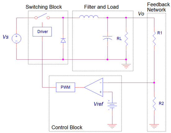 General block diagram of a non-isolated buck converter with its constitutive parts.